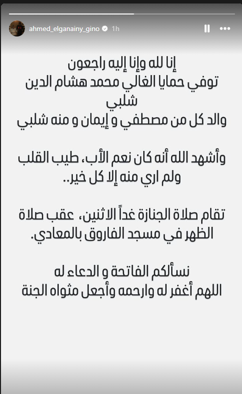 وكتب الجنايني: "إنا لله وإنا إليه راجعون، توفي حمايا الغالي محمد هشام الدين والد كل من مصطفى وإيمان ومنة شلبي، وأشهد الله أنه كان نعم الأب، طيب القلب ولم أر منه إلا كل خير".